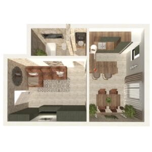 Acest apartament este compus dintr-un living spațios, un dormitor, o bucătărie deschisă cu zonă de luat masa și o baie.…